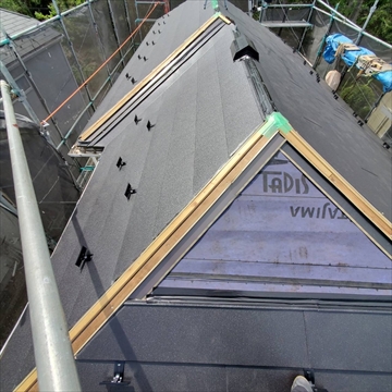 本日は屋根のカバー工法の現場レポートです。 既存の屋根を撤去せず、その上に防水シートと軽量な新しい屋根材を被せる屋根のロフォーム方法です。 既存の屋根材の上に防水シートを貼る作業を行います。 ・・・