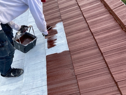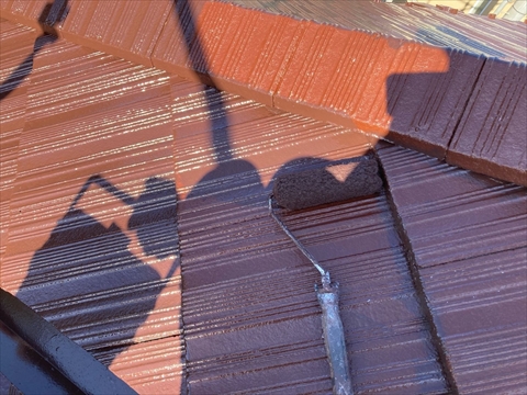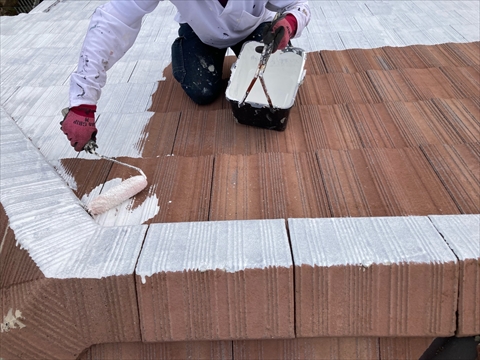 下塗りは、上塗り剤との接着の役割(密着性向上)、塗料の吸い込み防止、そして劣化した屋根材を強化する、塗装の耐久性を決めるとても重要な工程です。