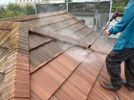 まずはカビ、苔、藻、古い塗膜を高圧洗浄で綺麗に落とします。