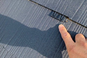 棟板金の繫目のシーリングの劣化と、屋根の藻、カビ、汚れが見受けられます。